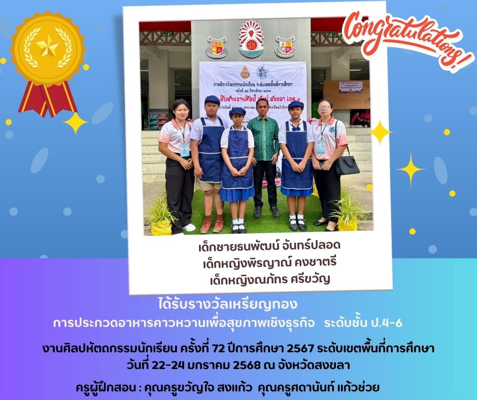 ชื่อผลงาน : รางวัลเหรียญทอง อันดับ 8 กิจกรรมอาหารคาวหวานเพื่อสุขภาพเชิงธุรกิจ ระดับชั้น ป.4-6 การแข่งขันศิลปหัตถกรรมนักเรียน ครั้งที่ 72